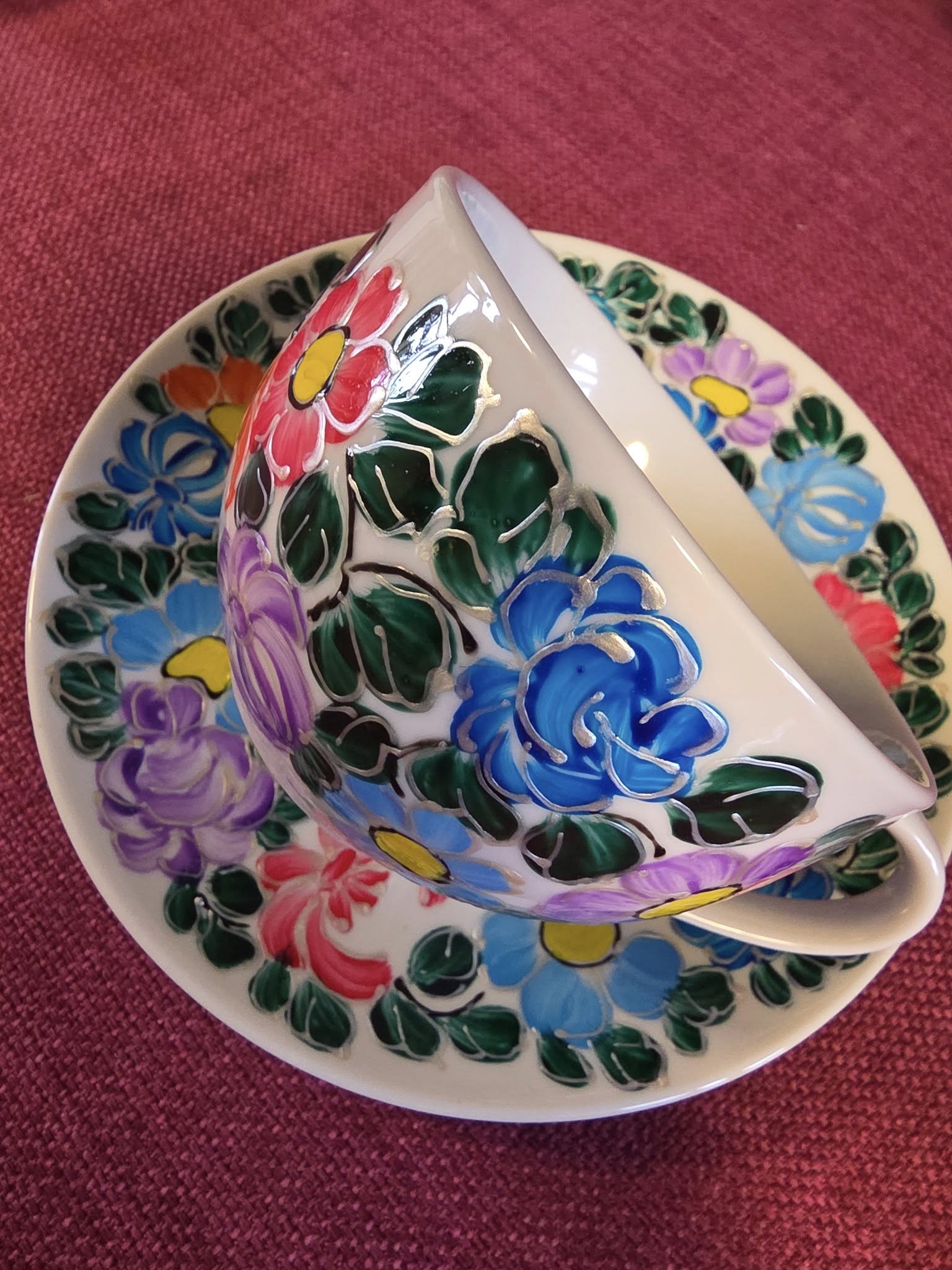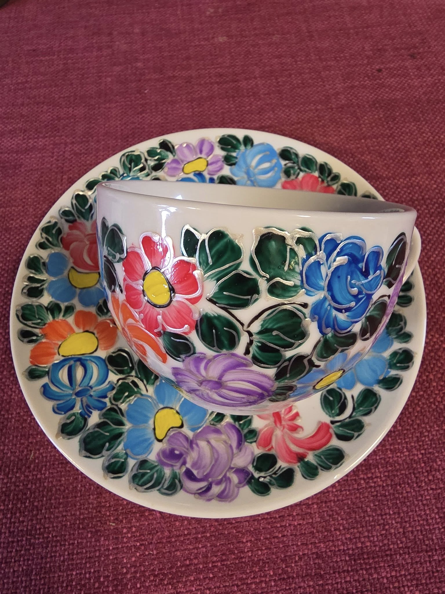 Filiżanka ze spodkiem – ręcznie malowana porcelana kolorowy folklor